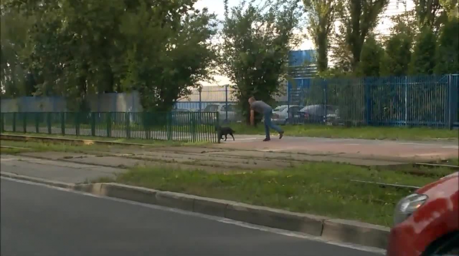 Kierowca pomaga psu przejśc przez drogę