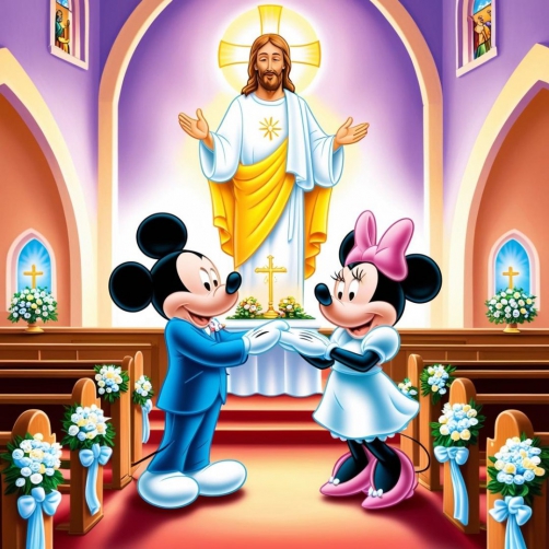 Miki i Minnie trzymają się za dłonie przed Panem Jezusem